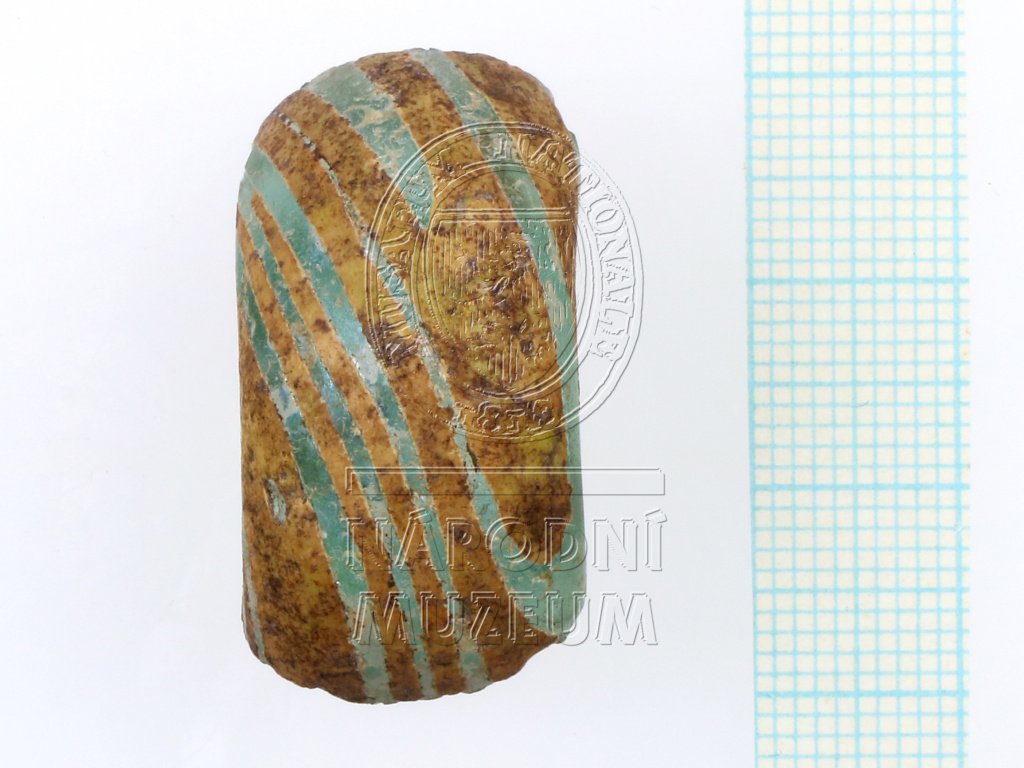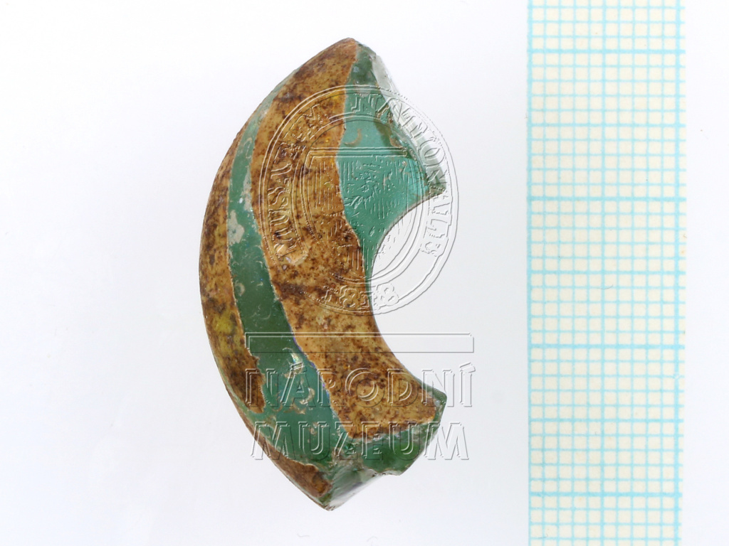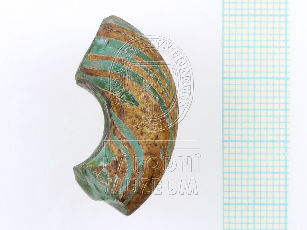 Část skleněného prsténcového korálu světle zelenomodré průsvitné barvy se šroubovitě vedenými žlutými proužky (mezi širšími proužky je dvojice úzkých proužků).