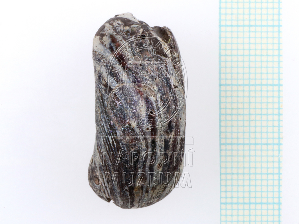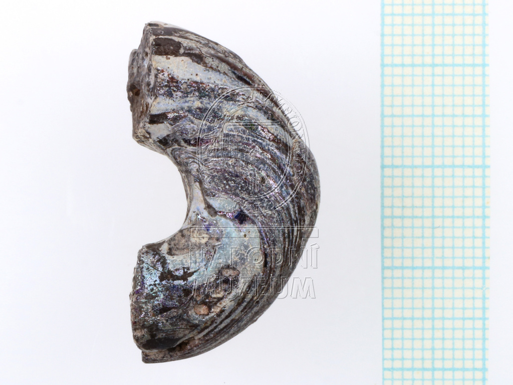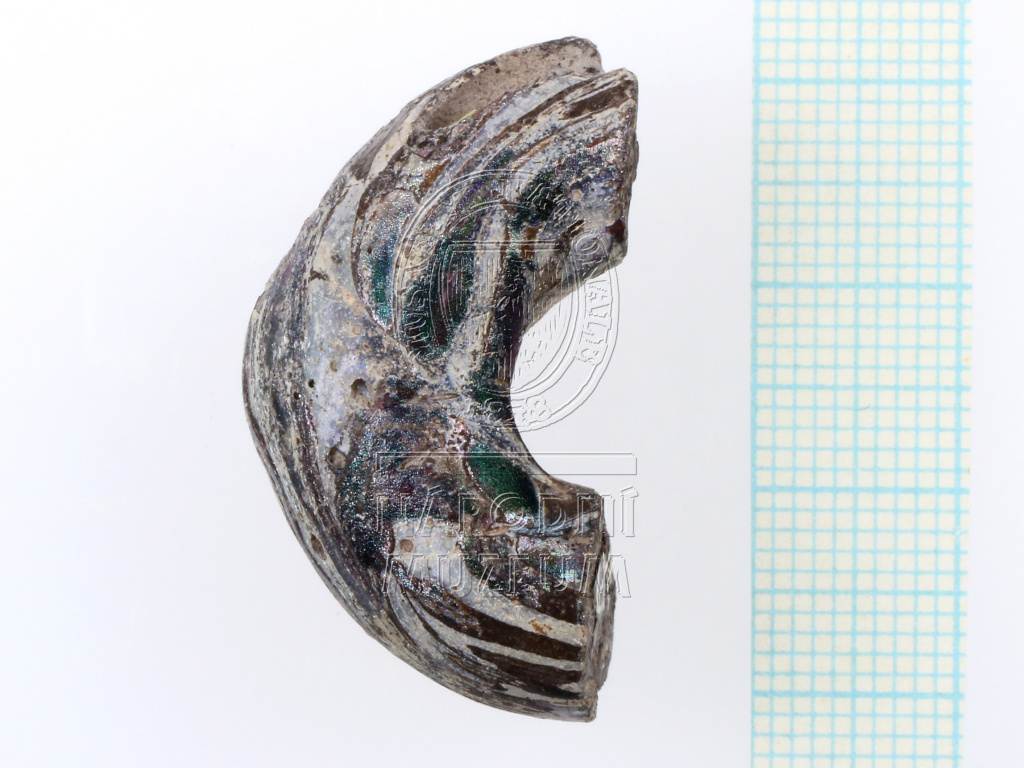 Část skleněného prsténcového korálu šedočerné neprůsvitné barvy s bílými nepravidelnými proužky, pásky a skvrnami, tvar deformován.