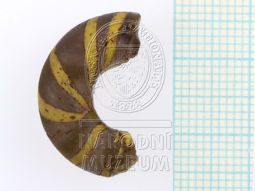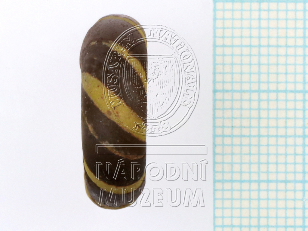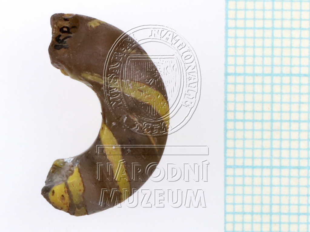 Část skleněného prsténcového téměř bezbarvého korálu (mírně nažloutlý) s příčnými a šikmými proužky žluté barvy.