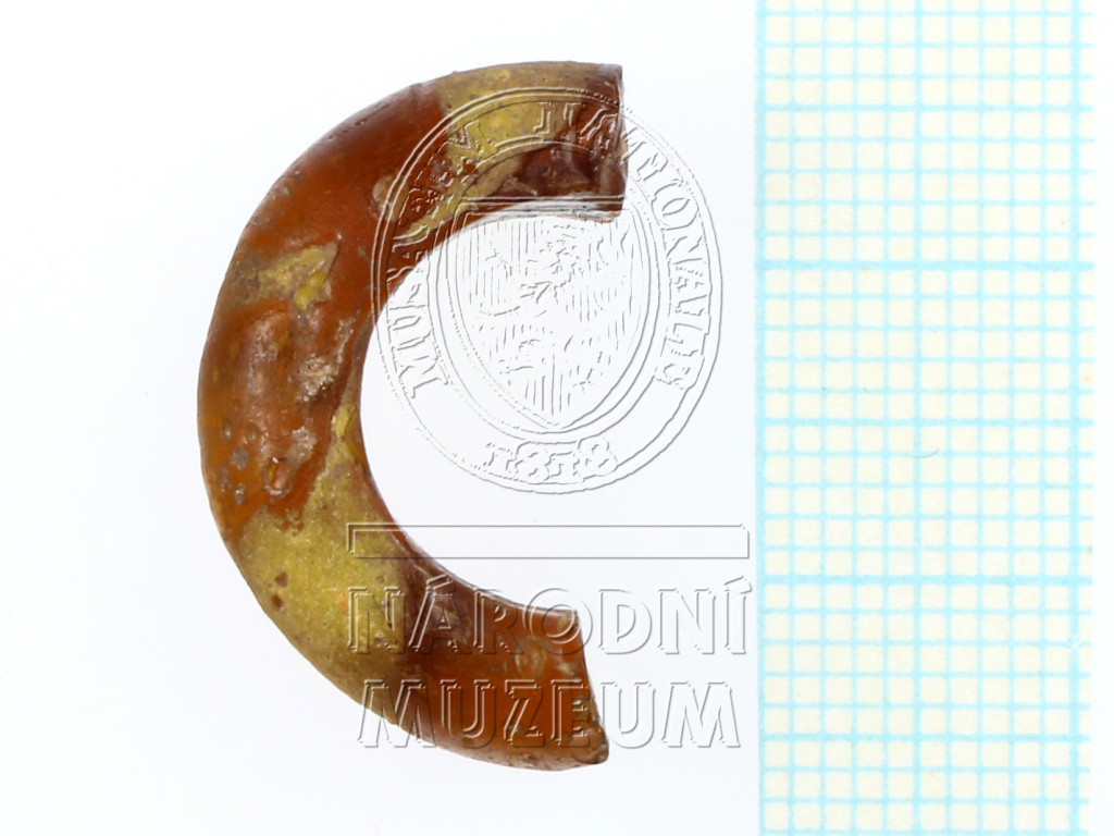 Část skleněného prsténcového korálu medově hnědé průsvitné barvy s příčnými a šikmými žlutými proužky.