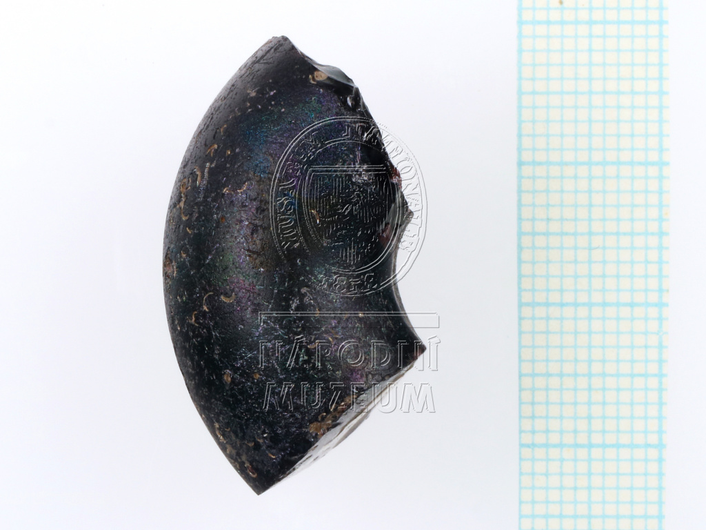 Část skleněného prsténcového korálu temně modré kobaltové barvy (téměř neprůsvitný), na povrchu skoro černé.