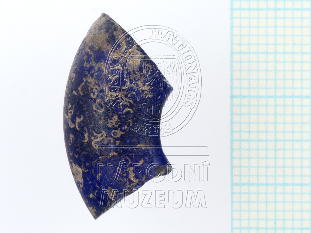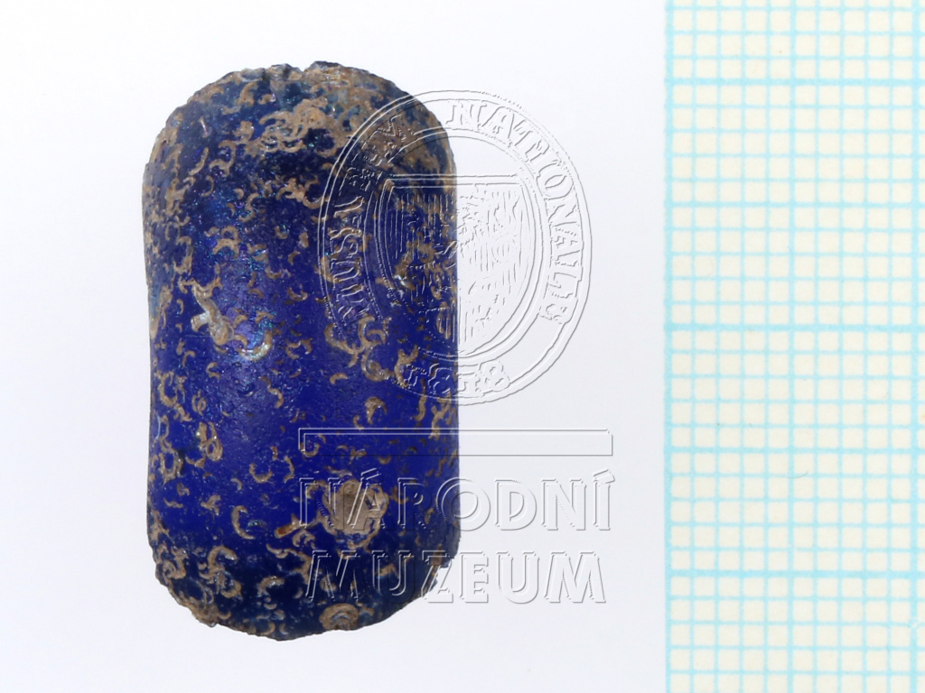 Část skleněného prsténcového korálu temně modré kobaltové barvy (téměř neprůsvitný), na povrchu skoro černé.