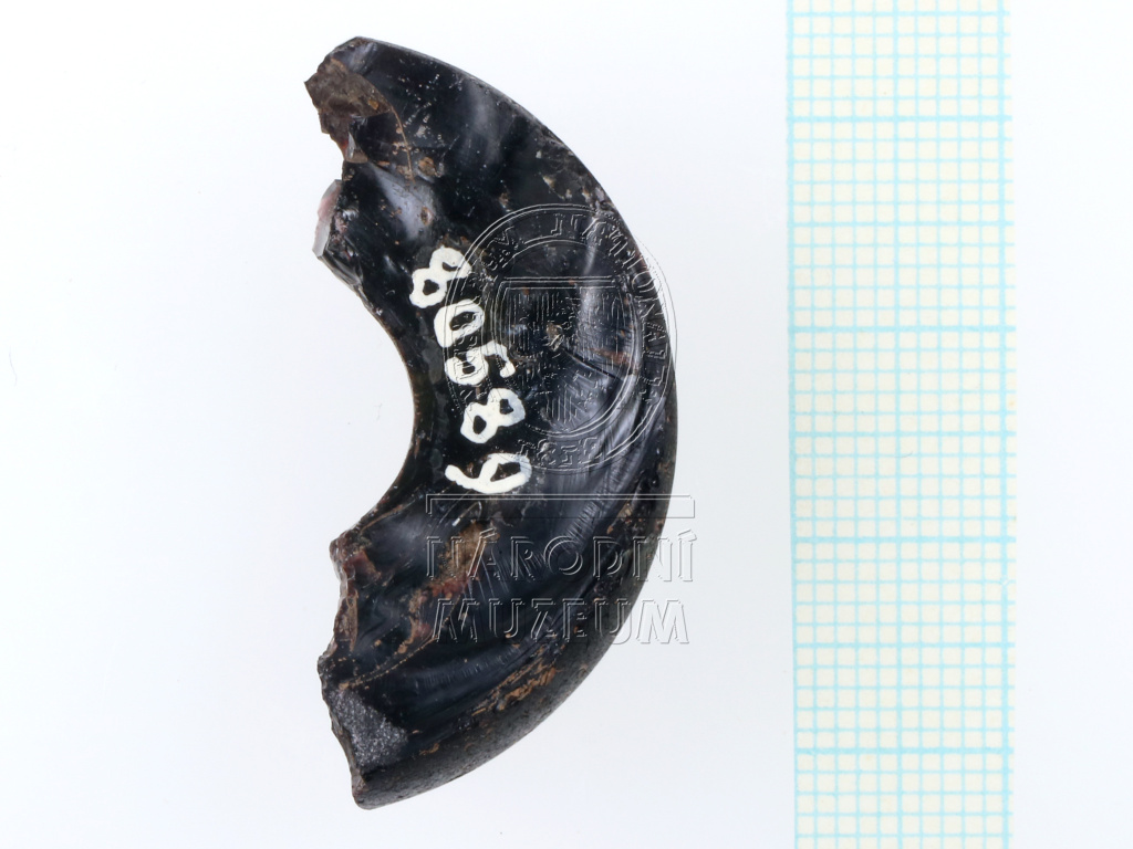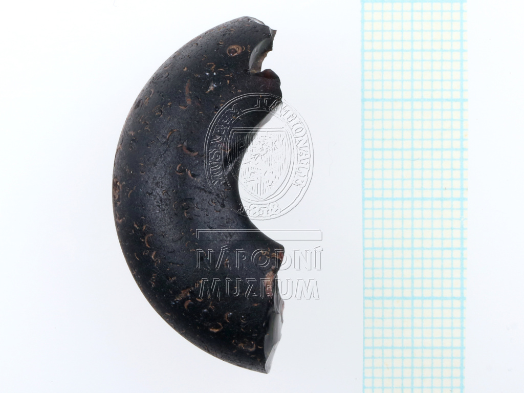 Část skleněného prsténcového korálu téměř černé neprůsvitné barvy, ve slabých vrstvách fialovohnědé barvy.
