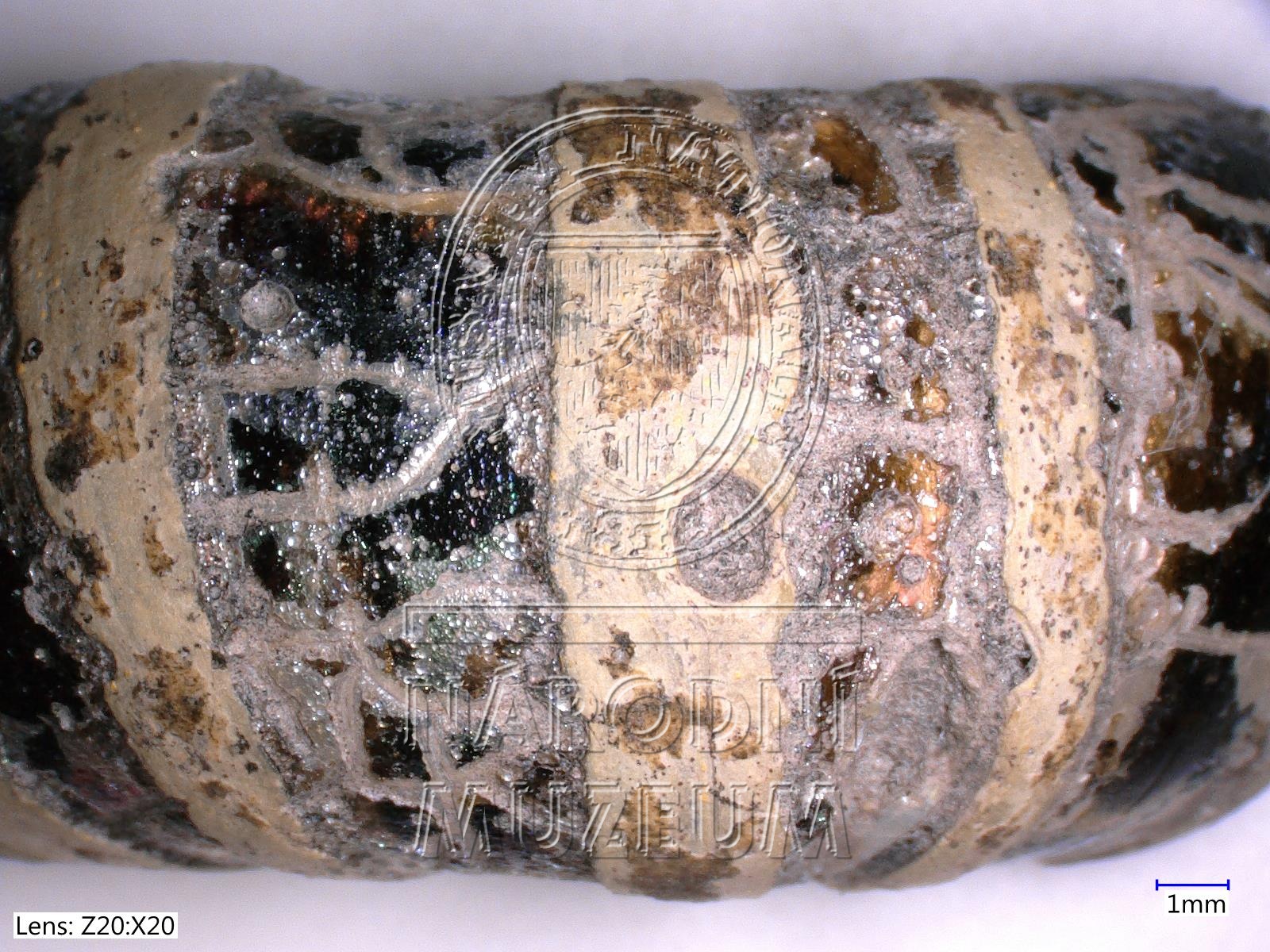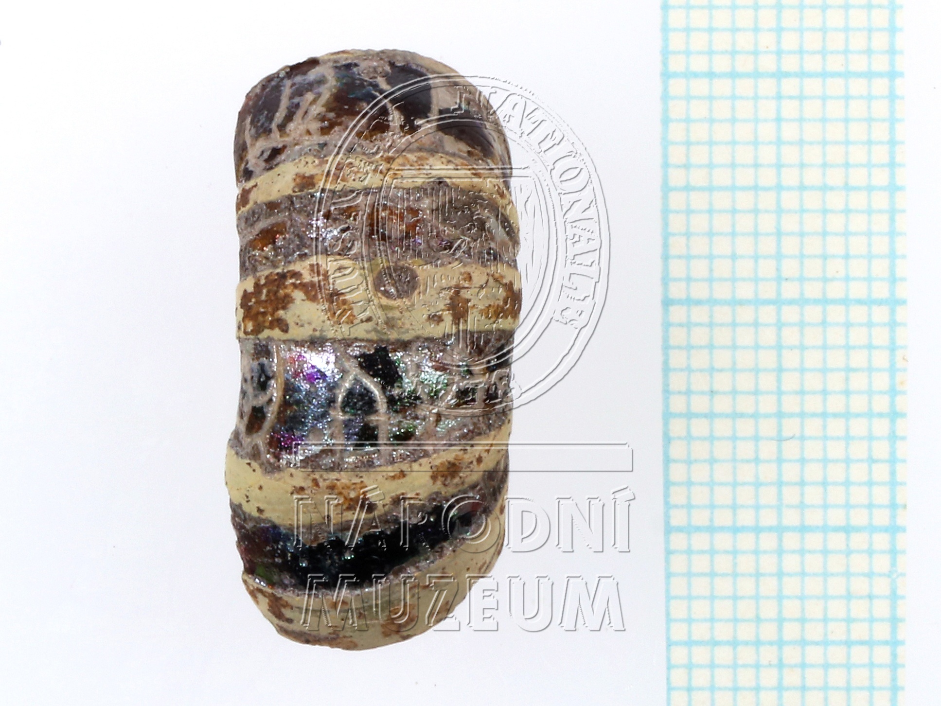 Část skleněného prsténcového korálu hnědé barvy s příčnými širokými proužky žluté barvy.