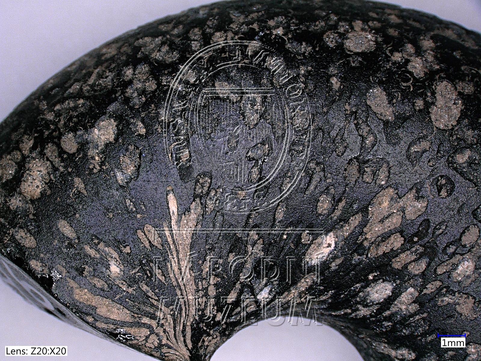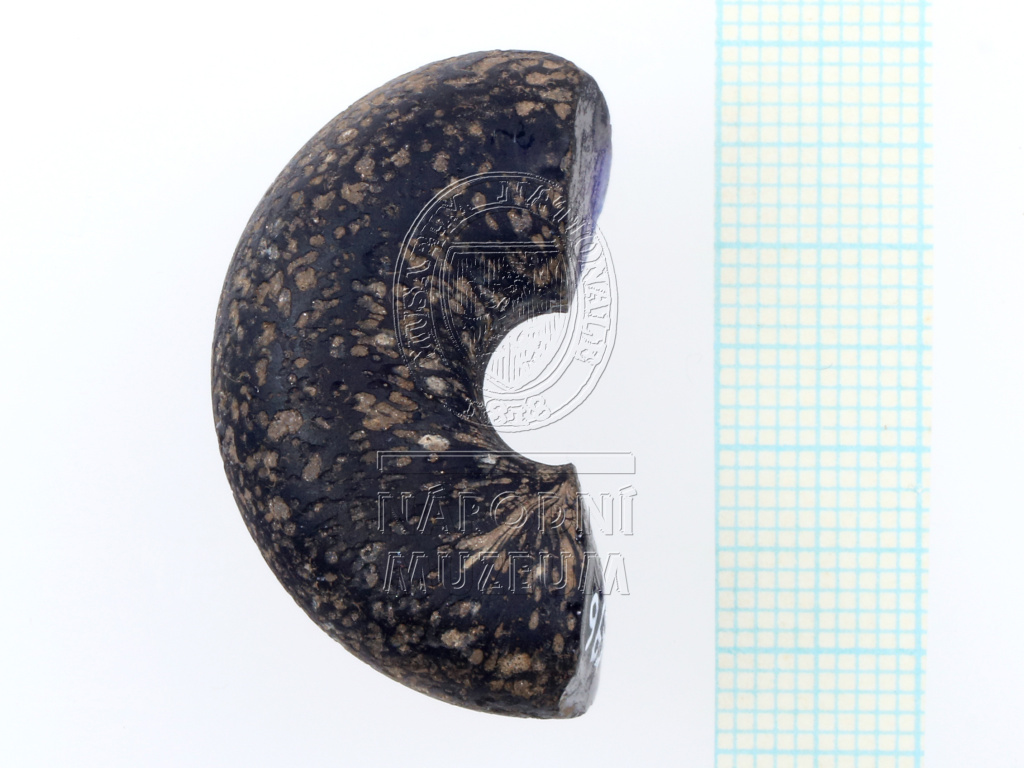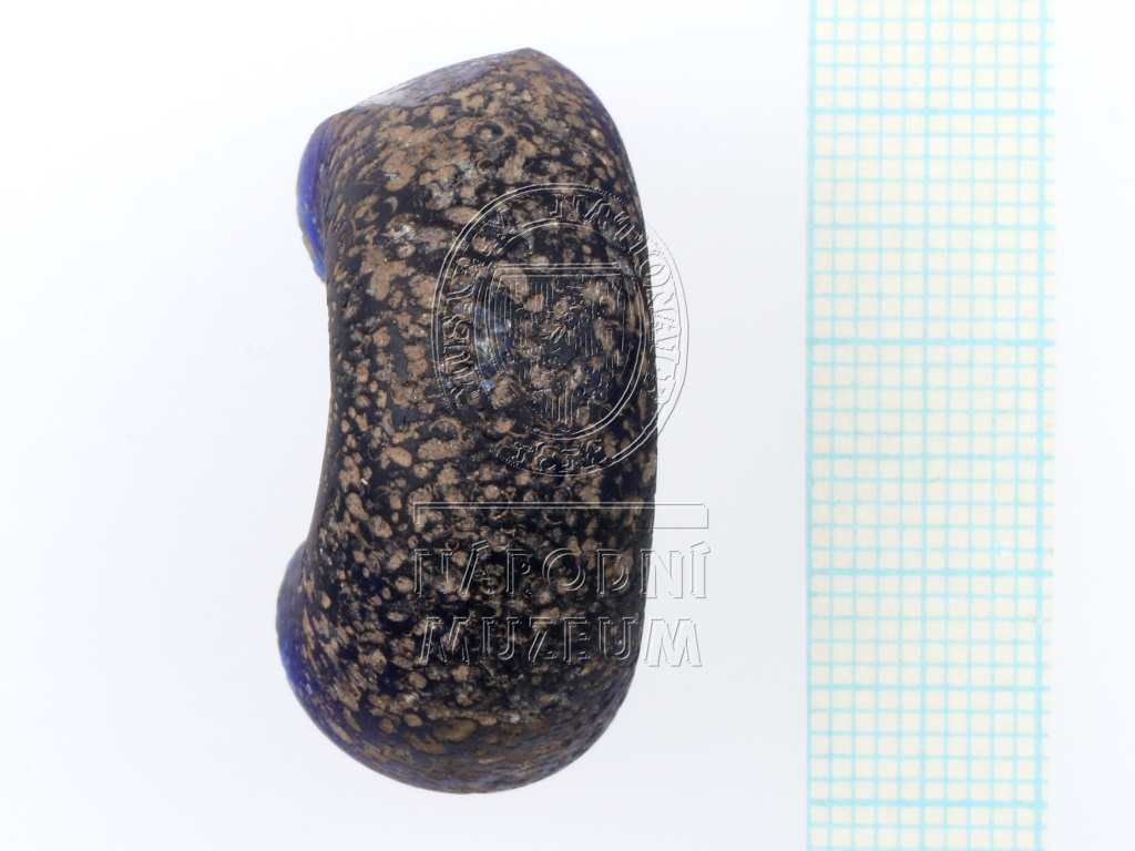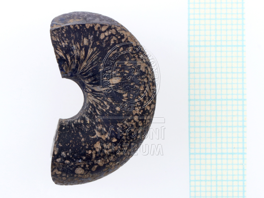 Téměř polovina skleněného prsténcového korálu temně modré až černé neprůsvitné barvy s četnými bílými skvrnami.
