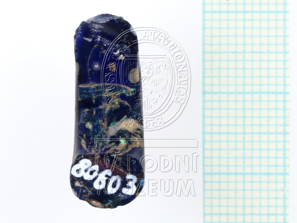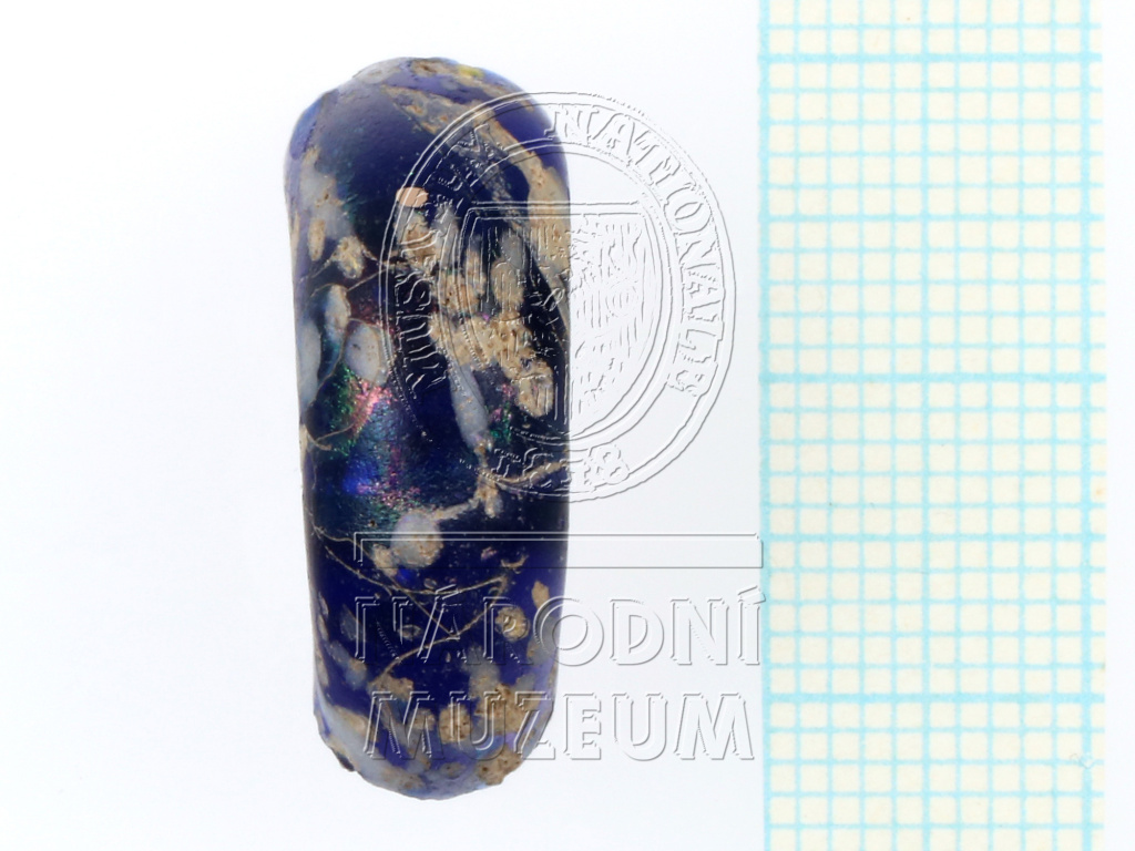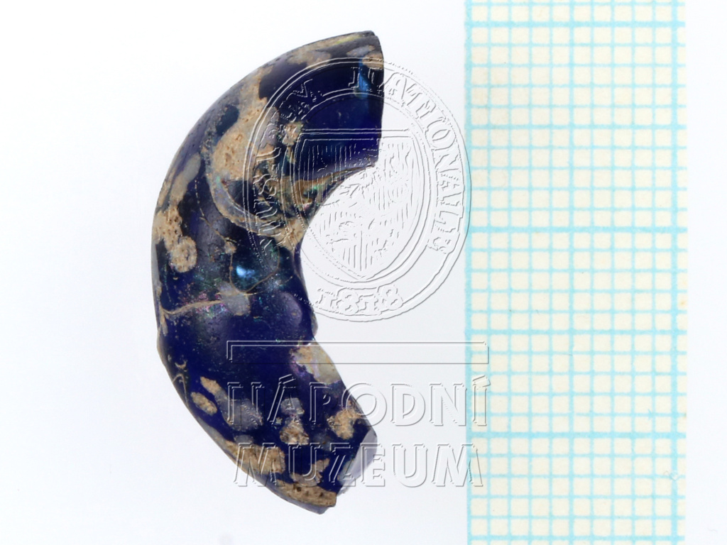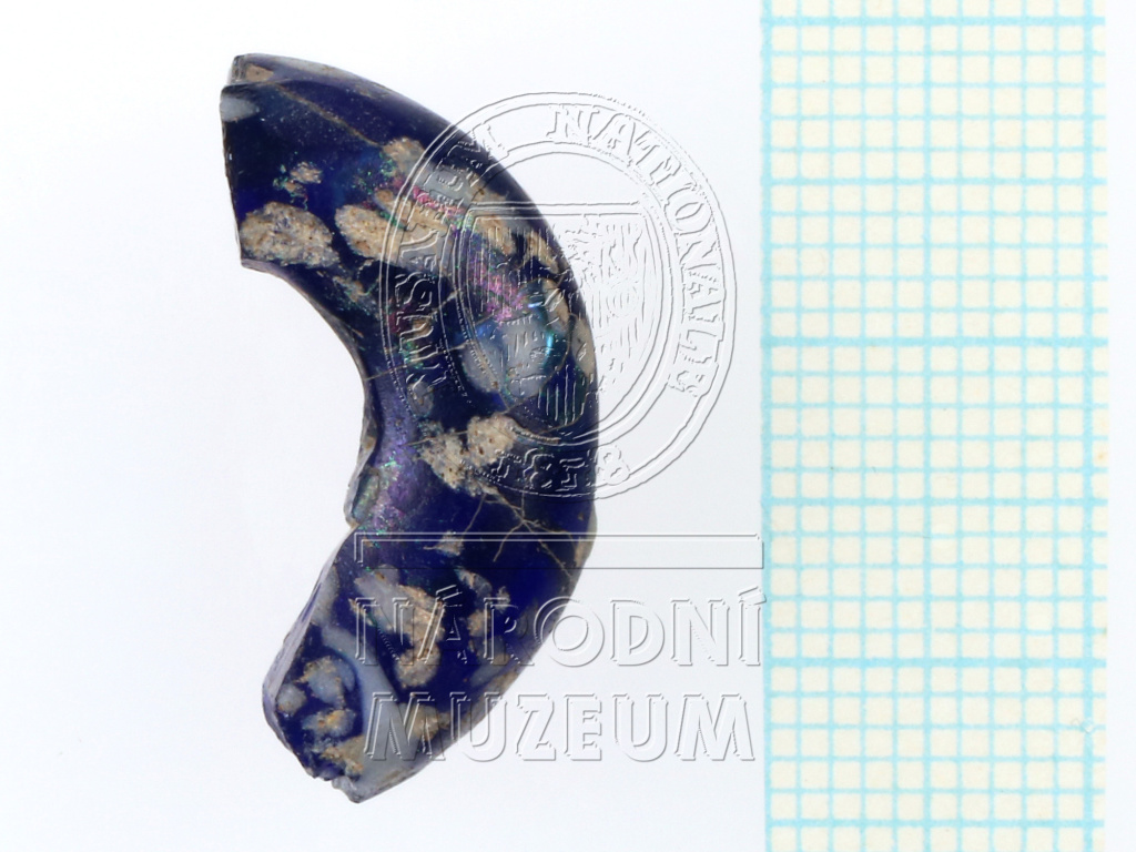 Část skleněného prsténcového korálu temně modré průsvitné barvy s bílými nepravidelnými skvrnami (např. tvar vidlice, půlměsíce).