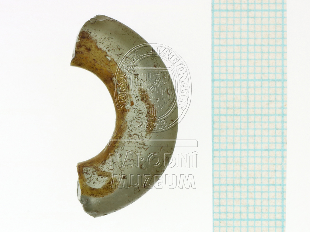 Část bezbarvého skleněného prsténcového korálu, mírně zakaleného.